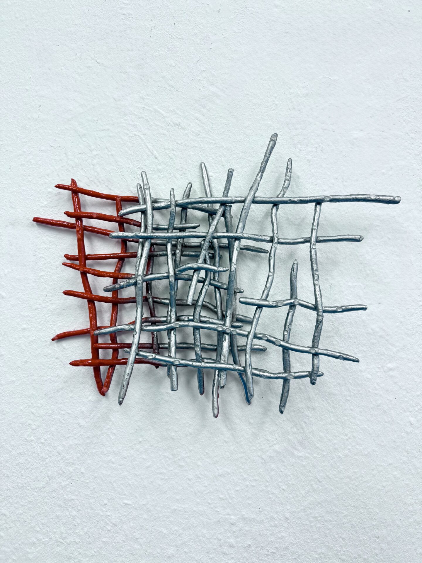 In meiner neuen Serie aus Keramik und Kunststoff setze ich meine Untersuchung fort, wie sich Zeichnung in Skulptur verwandelt, und löse zugleich die Grenze zwischen Linie und Raum auf. Die Arbeiten erinnern an transformierte Gewebestrukturen: Linien kreuzen sich, verschieben sich, bilden ein rhythmisches Geflecht aus Leerräumen und Überschneidungen.